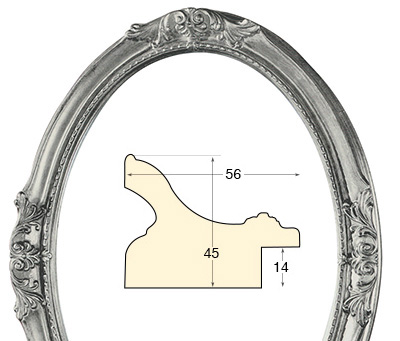 Cadre ovale en argent mesurant 30x40 cm avec décorations appliquées au centre des quatre côtés.